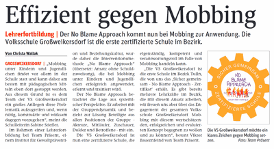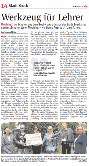 über das Projekt, welches wir gemeinsam mit dem Römerland Carnuntum und den Schulen der Regiom umsetzen konnten. Als erste Stadt in Österreich sind alle Schulen der Stadt Bruck an der Leitha und insgesamt 19 Schulen der Region nun "Sicher gemeinsam" - zertifiziert und haben an der Schule Lehrkräfte, die im Fall von Mobbing mit dem No Blame Approach intervenieren können.